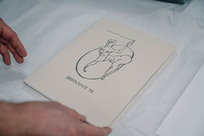 Innocence ’93 exists both as a book and as an exhibition, where the drawings unfold gradually in space. The exhibition opening included a performative unveiling of the works, revealing them one by one during the event and emphasizing time, anticipation, and shared presence as part of the experience.